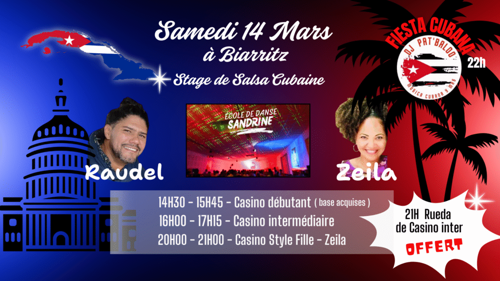 SAMEDI 14 MARS 2026 – Stage de SALSA avec RAUDEL & Style fille avec ZEILA -Fiesta CUBANA DJ pat’boloo